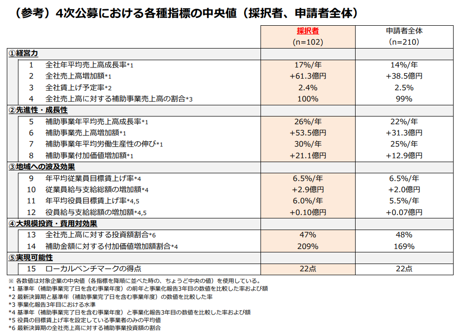 特設サイトにて4次公募における各種指標の中央値が公表されています。